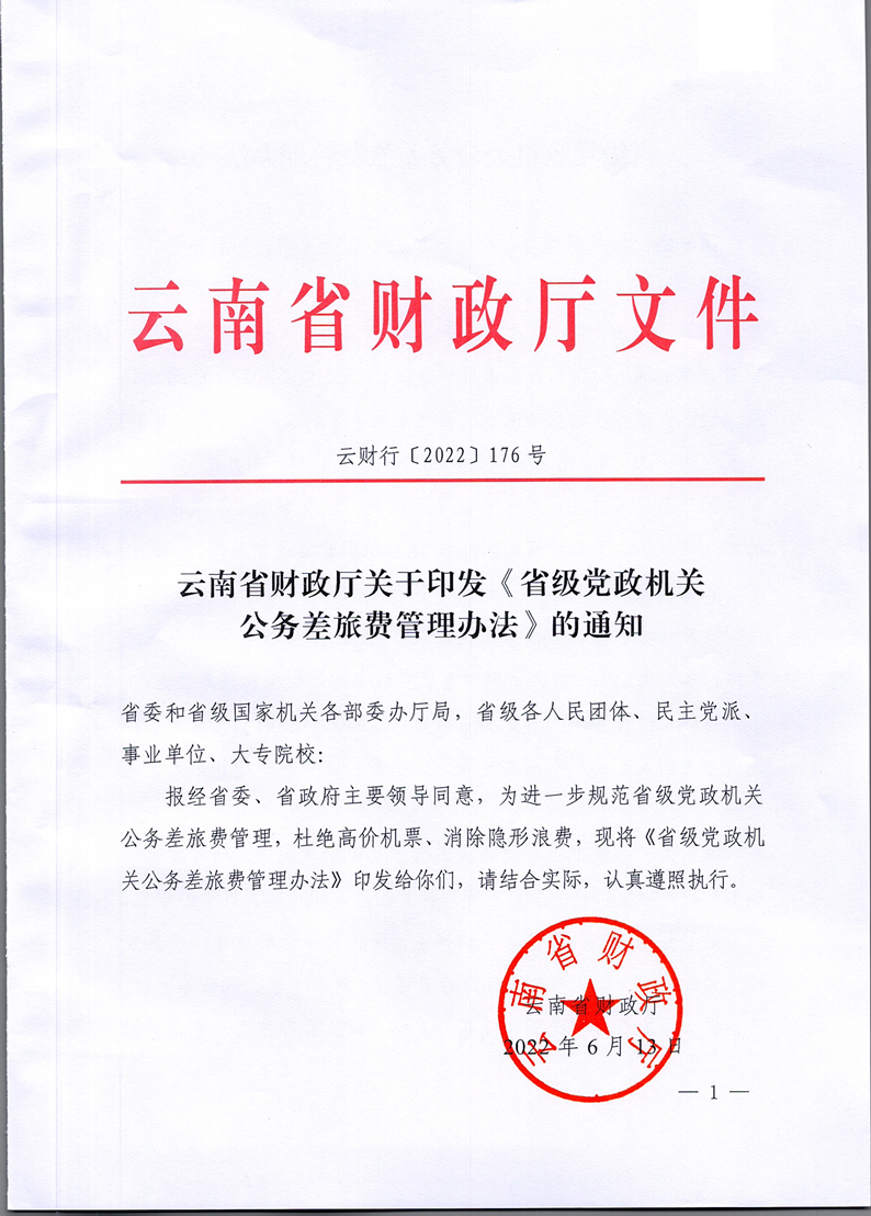 云南省财政厅关于印发《省级党政机关公务差旅费管理办法》的通知