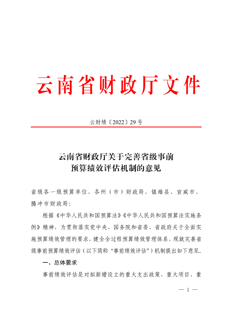 云南省财政厅关于完善省级事前预算绩效评估机制的意见