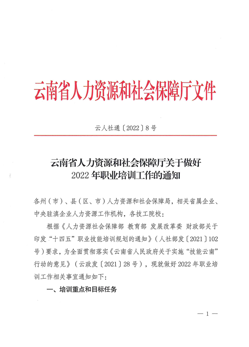 云南省人力资源和社会保障厅关于做好2022年职业培训工作的通知(云人社通〔2022〕8号) 来源: 发布时间:2022-12-12 10:17:04 浏览次数: 次 【字体:小 大】 分享到: 【打印正文】