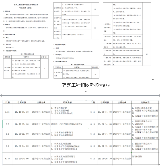 根据考核要求,培训内容包括识图和绘图两部分。识图内容具体包括建筑投影知识、建筑制图标准应用、建筑平面图的识读、立面图的识读、剖面图的识读、建筑设计说明和其他文件的识读;绘图内容具体包括绘图环境设置、绘图环境与打印样式设置、虚拟打印输出、三面投影图绘制、轴测图绘制、建筑平面图绘制、立面图绘制、剖面图绘制。培训教师根据考核内容编写授课计划,以保证此次培训能够按时保质的完成。
