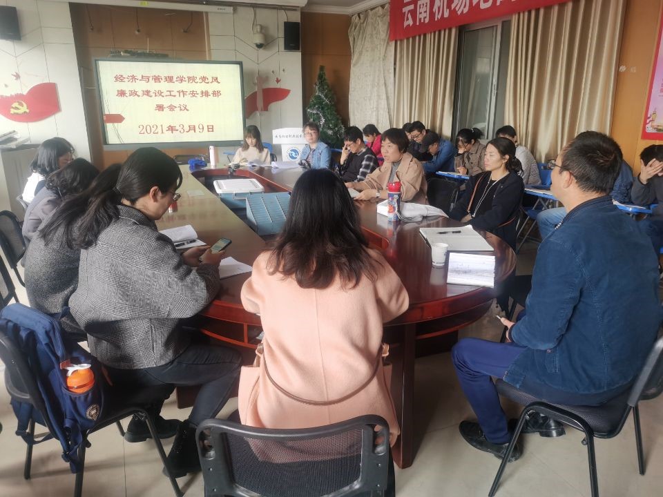为研究部署新学期党风廉政工作,坚持廉政工作不松懈,经济与管理学院于2021年3月9月中午在商务谈判室召开专题会议安排部署本学期党风廉政建设工作并开展相关学习。