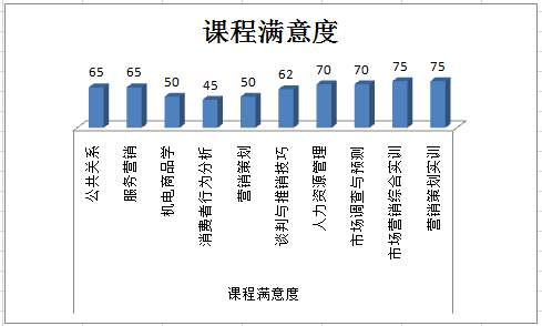 六、课程评价。大部分同学对各专业课的满意度较高,其中满意度在前三的课程分别是:《营销策划实训》、《市场营销综合实训》、《市场调查与预测》《人力资源管理》。如图6所示。