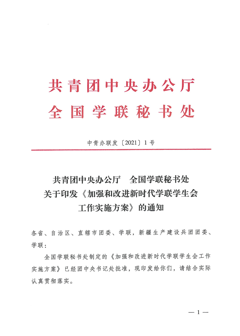 共青团中央办公厅全国学联秘书处关于印发《加强和改进新时代学联学生会工作实施方案》的通知(中青办联发〔2021〕1号) 来源: 发布时间:2024-09-30 20:10:08 浏览次数: 次 【字体:小 大】 终审:赵艳妮 分享到: 打印文章