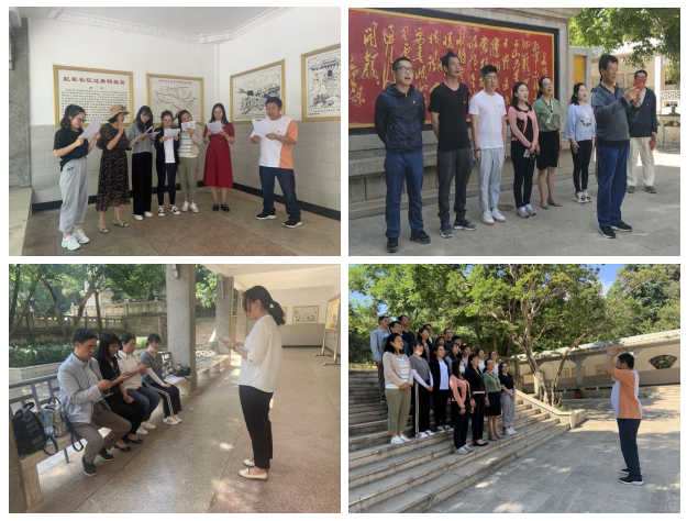 随后,学院3个党支部分别开展形式多样的特色学党史活动,第一党支部朗诵长征诗词,深入学习红军长征过嵩明的故事,合唱《长征组歌:四渡赤水出奇兵》,感受到了红军战士过雪山、涉草地的钢铁意志。第二党支部现场学习《中国共产党简史》,诵读毛泽东同志的《七律.长征》和《满江红》,合唱《我和我的祖国》红歌,感受到了中国共产党走过的艰辛历程,更加坚定了自己“爱国护党”信念。第三党支部学习“亢慕义斋”故事,汲取革命智慧力量,坚定共产主义理想信念。