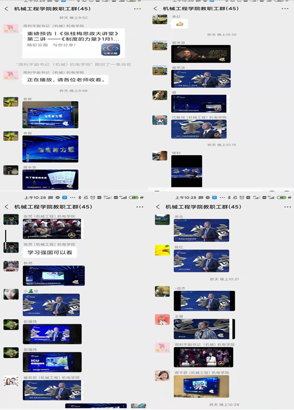 播出当晚,学院全体教职工在收看了“张桂梅思政大讲堂”第二讲后,纷纷将自己的收看过程以截图方式发在微信群里进行互动,大家一致认为,将深入学习贯彻落实习近平总书记在全国抗击新冠肺炎疫情表彰大会上的重要讲话精神,不断弘扬伟大的抗疫精神,继续做好学院师生在寒假期间的疫情防控工作,向优秀代表学习,勇担使命,争做新时代“四有”好老师。