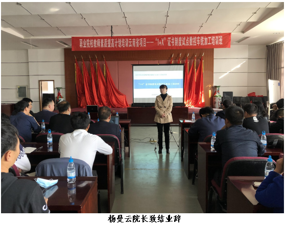 2021年3月20日,机械工程学院承办的国培项目:职业院校教师素质提高计划培训项目-“1+X”证书制度试点数控车铣加工培训班结业汇报会与颁证仪式在云南CY集团举行。机械工程学院杨曼云院长对本此培训进行了总结,激励全体学员将所学知识和技能充分运用到教学和学生培养过程中,为“1+X”证书制度试点改革工作的大力推广贡献力量。