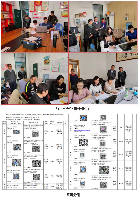 根据疫情防控相关要求,此次顶岗实习答辩采取“线上答辩”方式进行。机械工程学院顶岗实习领导小组在全体顶岗实习学生中随机抽取100名学生进行线上公开答辩,公开答辩分10个组进行。其余学生线上答辩由各指导教师有序组织进行。答辩平台为腾讯会议,答辩过程全程录屏存档。