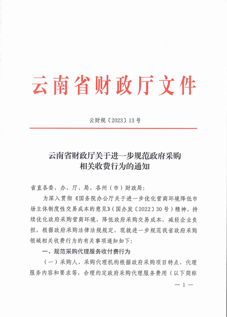 云南省财政厅关于进一步规范政府采购相关收费行为的通知(云财规〔2023〕13号) 来源: 发布时间:2024-06-04 11:33:03 浏览次数: 次 【字体:小 大】 终审:虎智猛 分享到: 【打印正文】