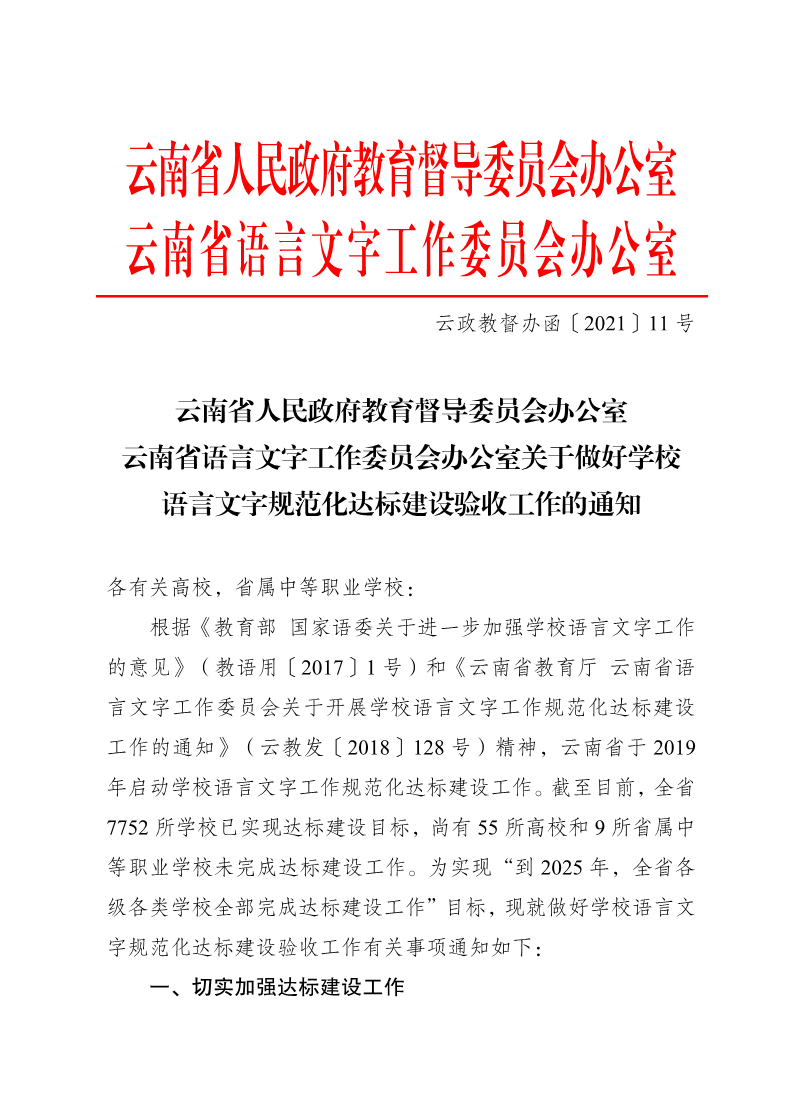 云南省人民政府教育督导委员会办公室 云南省语言文字工作委员会办公室关于做好学校语言文字规范化达标建设验收工作的通知 来源: 发布时间:2025-01-20 17:53:18 浏览次数: 次 【字体:小 大】 分享到: 【打印正文】