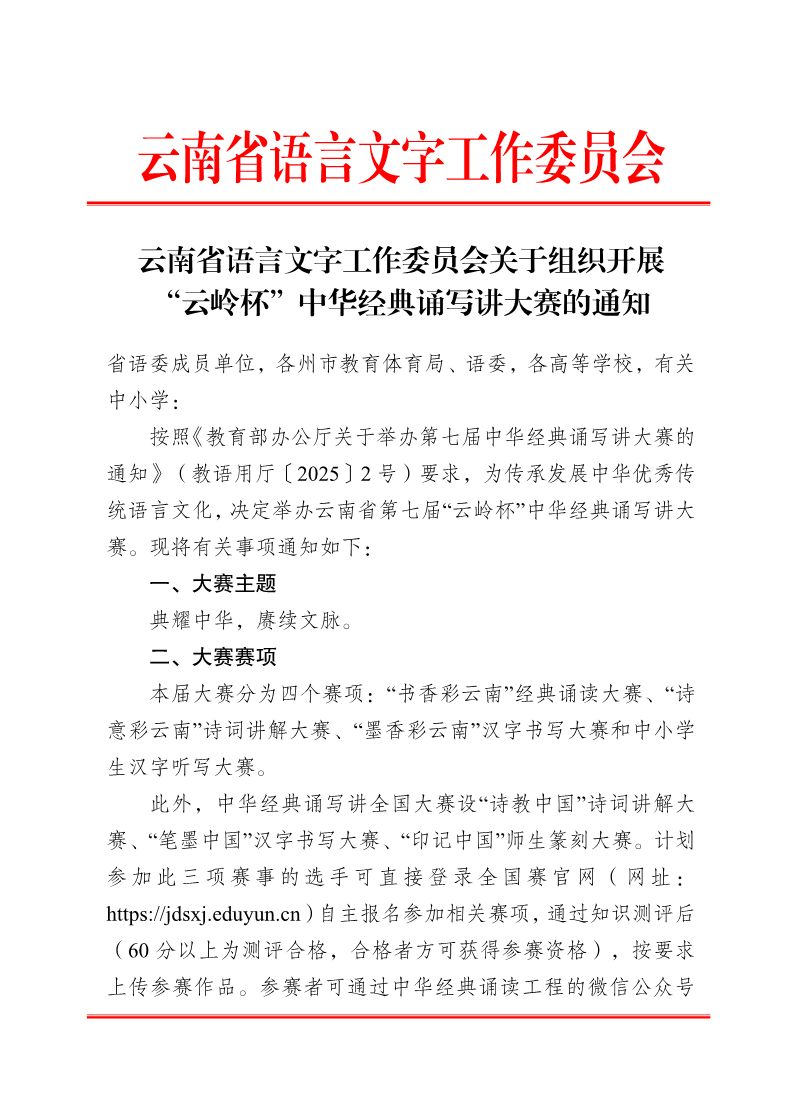云南省语言文字工作委员会关于组织开展“云岭杯”中华经典诵写讲大赛的通知_正文